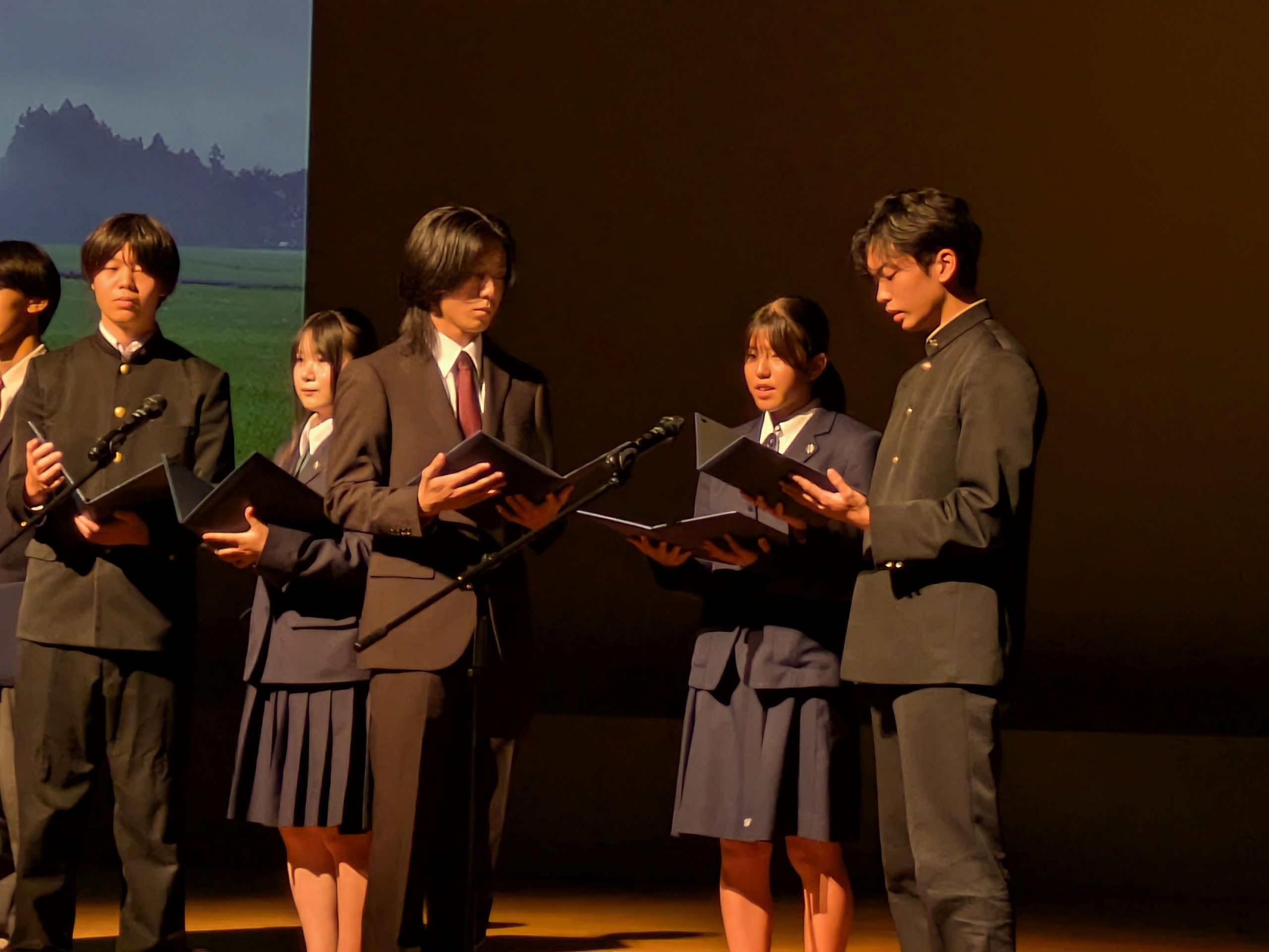 オープニングアトラクションの「天神ばやし」につづき、十日総合高校、松代高校の生徒とともに、全日制と定時制あわせて3人の十日町高校生が「十日町市民憲章」の朗読を行いました。