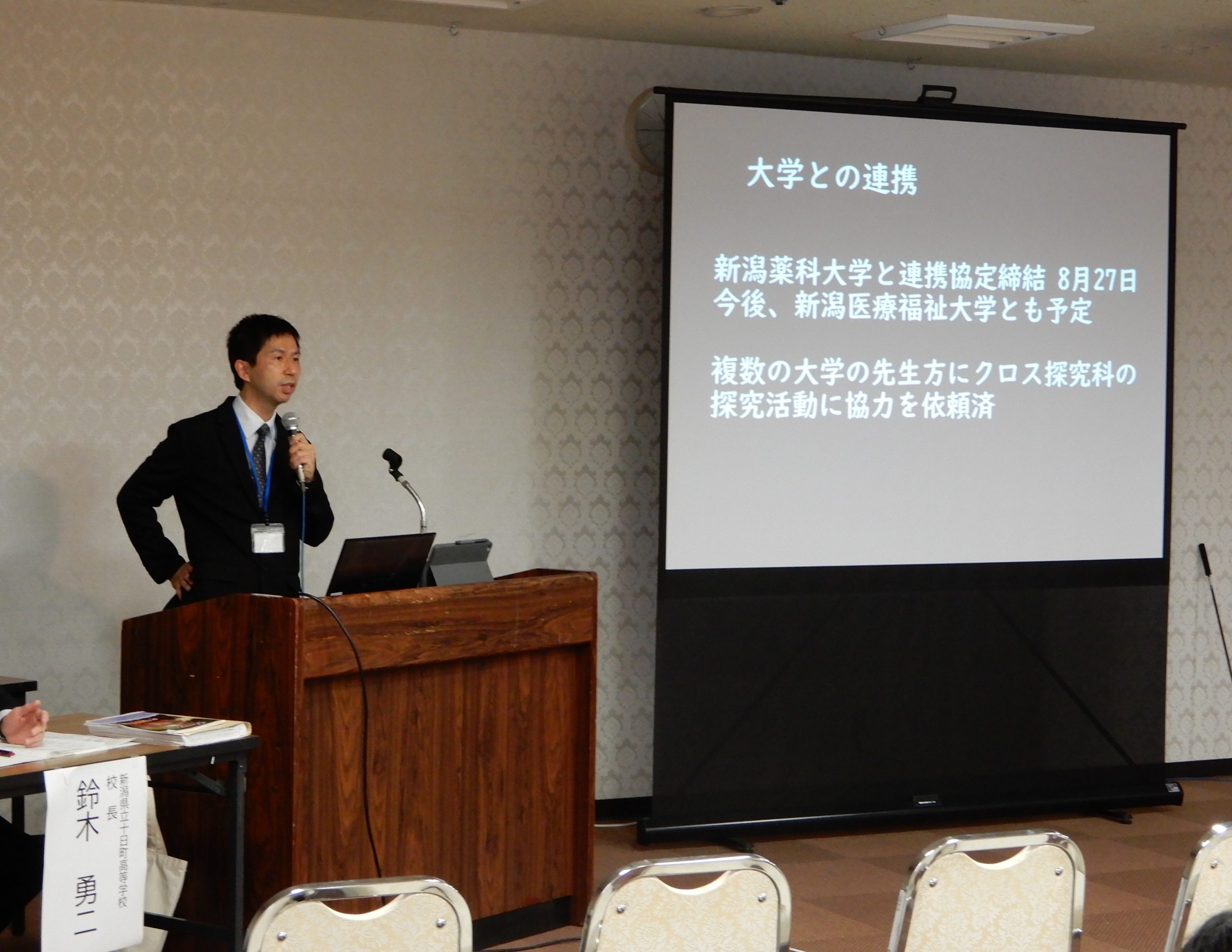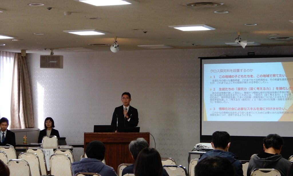 学校長の開会挨拶につづき、本校職員によるクロス探究科の概要説明を行いました。